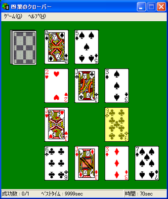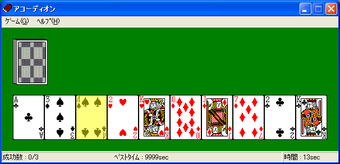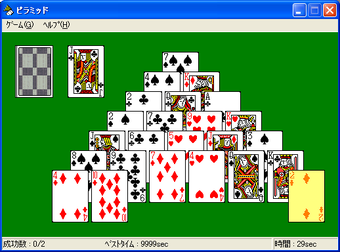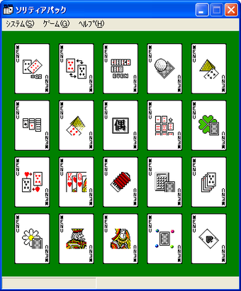ソリティアパックには一人ポーカーやソリティア始めとした、以下の20ゲームが同梱されています。(1)クロンダイク(Windows標準搭載のソリティア/Solitaireに相当)、(2)ピラミッド、(3)テン・プレイ、(4)モンテカルロ、(5)イーブン、(6)ゴルフ、(7)ブレークピラミッド、(8)偶数、(9)パズルカード、(10)四葉のクローバー、(11)カップル、(12)ロイヤルマリッジ、(13)アコーディオン、(14)カルキュレーション、(15)サーティ・ダウン、(16)フラワー、(17)モンテクリフト、(18)カドリール、(19)アラウンド・ザ・ディック、(20)ひとりポーカー。好きなものを選んでプレイしましょう。